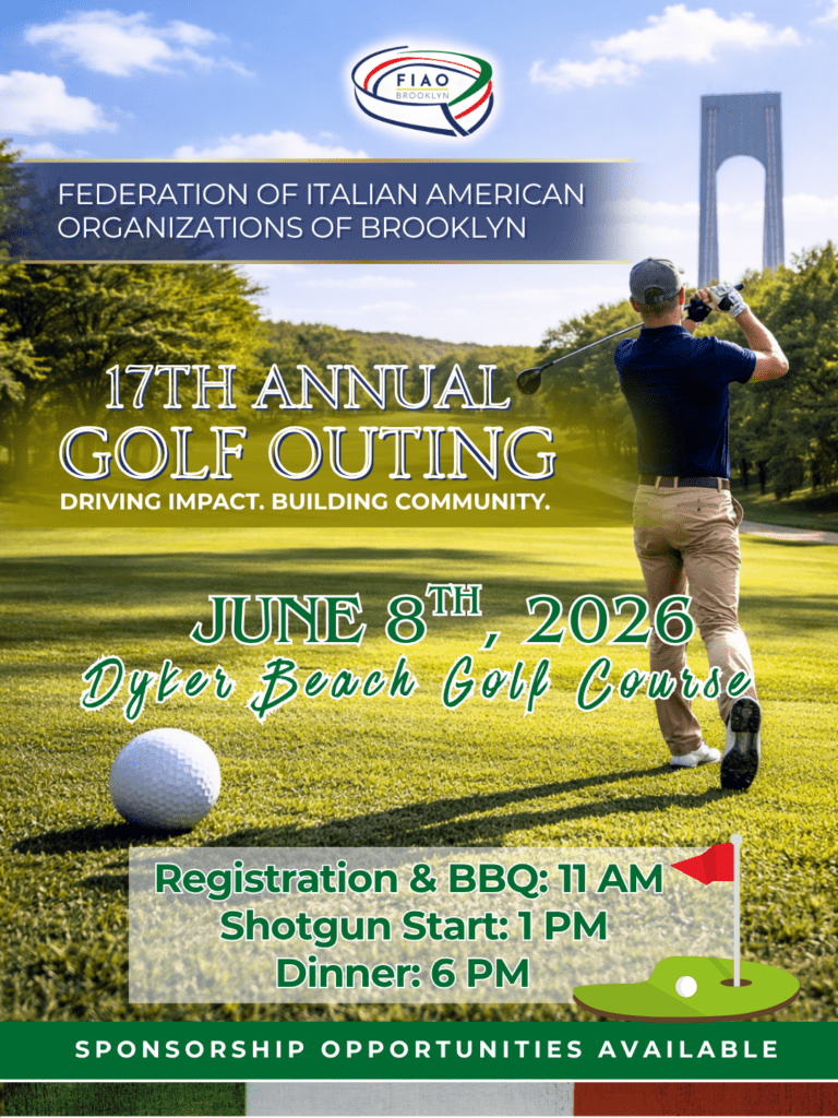 17th Annual Golf Outing CLICK HERE FOR SPONSORSHIP, REGISTRATION & MORE! June 8, 2026 8:00 AM - 5:00 PM Dyker Beach Golf Club + Google Map The Federation of Italian American Organizations Brooklyn FIAO Fundraiser