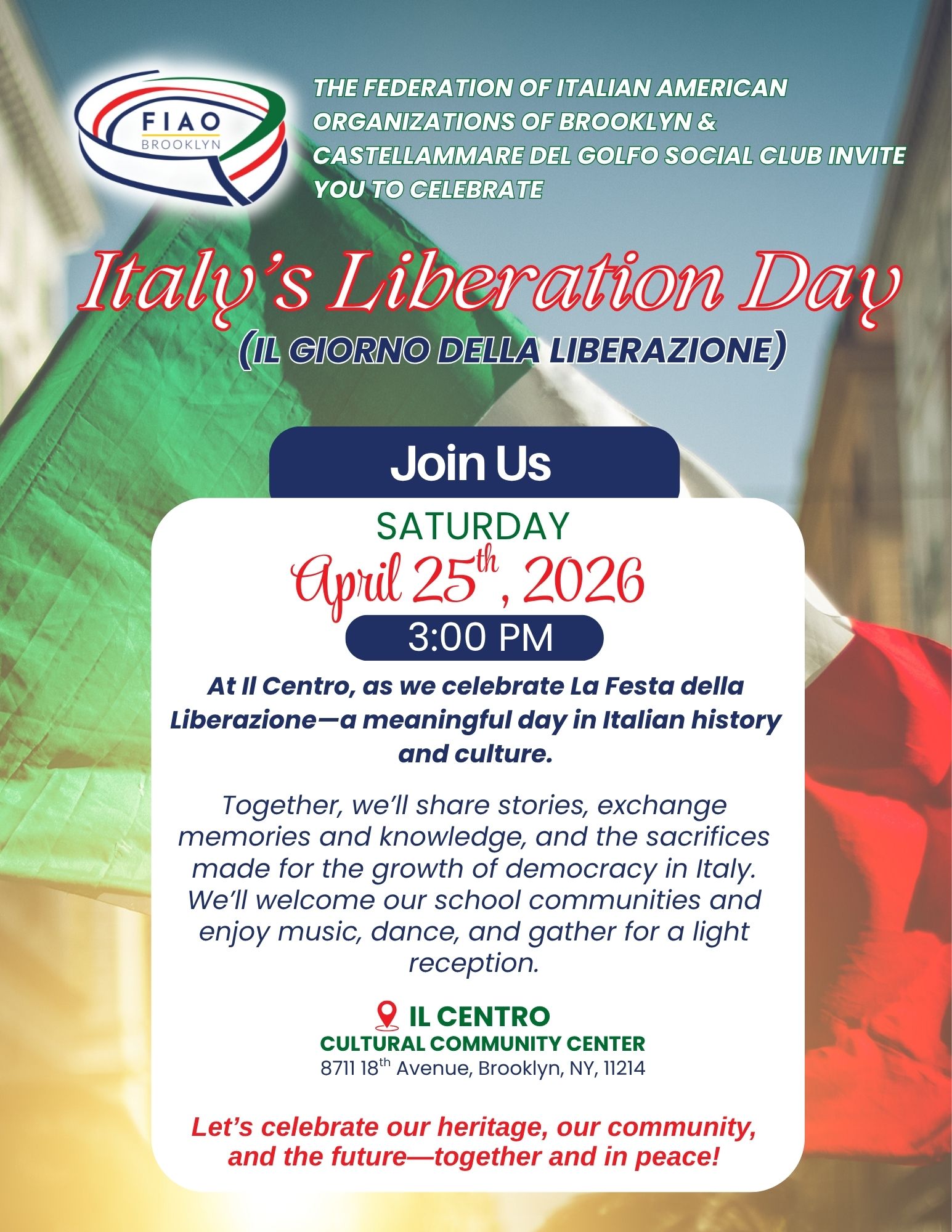 April 26, 2026 3:00 PM - 5:00 PM Il Centro Community Center + Google Map The Federation of Italian American Organizations Brooklyn Il Centro