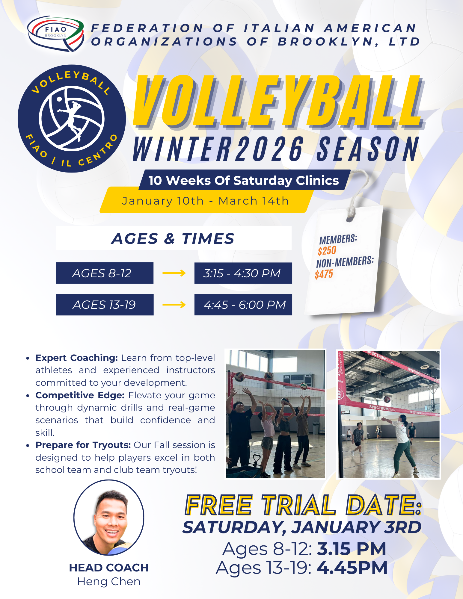 Circle your calendars as the season begins on Saturday, January 10th and extends until March 14th. PLUS take advantage of a FREE TRIAL date on Saturday, January 3rd: 8 to 12 year olds at 3:15pm and 13 to 19 year olds at 4:45pm. Don’t let this fantastic chance slip away to elevate your abilities, forge lasting connections, and experience pure joy on the court! Enroll now for these electrifying clinics at Il Centro Community Center.